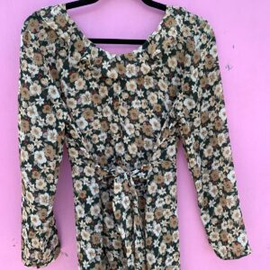 1990S SHEER FLORAL PRINT LONG SLEEVE WIDE NECK BELTED DRESS W/ RUFFLE TRIM