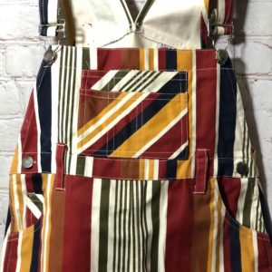 EARTH TONED MULTI-STRIPED OVERALL SHORTS W/ SKINNY STRAPS & METAL BUTTONS
