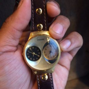 PIERRE DOUBLE FACE ROMAN NUMERAL 80\\S GOLD BROWN AND BLACK LEATHER STRAP WRIST WATCH