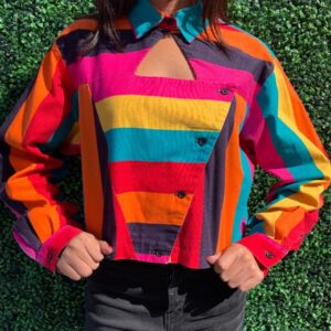 CROPPED 1990S MULTI COLORED STRIPED WESTERN TOP SNAP BUTTON FLAP & CUTOUT