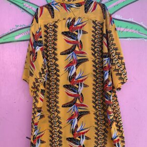 STUNNING! 100% SILK BOLD RETRO BIRDS OF PARADISE PRINT HAWAIIAN SHIRT, COCONUT BUTTONS
