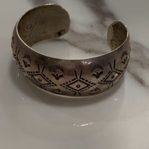 NAVAJO WIDE STERLING SILVER CUFF BRACELET SOUTHWESTERN NATIVE DESIGN STAMPING STAMPING SIGNED W.TRACY