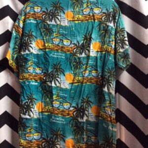 SS BD Hawaiian Shirt Teal Orange Suns Palm Trees Sunglasses Pattern