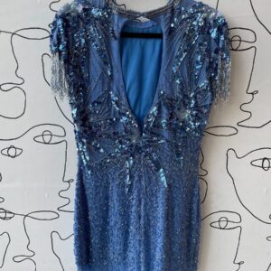 BLUE 1980S ALL OVER SEQUIN BEADED FIREWORK MOTIF MINI DRESS FRINGE SLEEVES