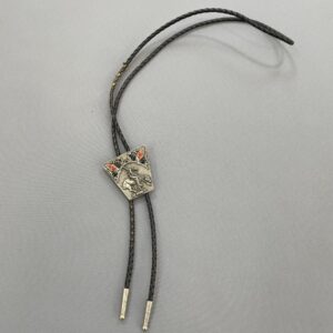 *AS-IS* 1990S ETCHED SILVER NATIVE AMERICAN ON HORSE ENAMELED ACCENTS BOLO TIE WOVEN BLACK LEATHER CORD