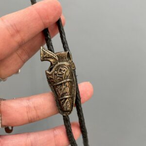 ETCHED BRONZE GUN & HOLSTER PENDANT BLACK LEATHER WOVEN CORD BOLO TIE