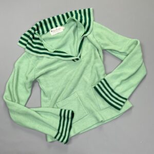 ADORABLE! 1960S STRIPED FOLD-OVER COLLAR DEEP V SWEATER, BELL SLEEVES, DOUBLE FRONT POCKET
