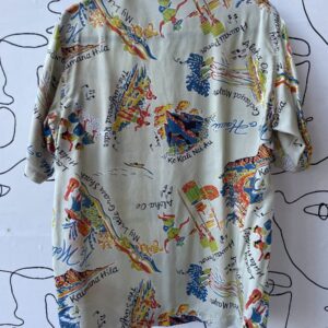 COLORFUL GRAPHIC PRINT HAWAIIAN TEXT BUTTON UP SHIRT