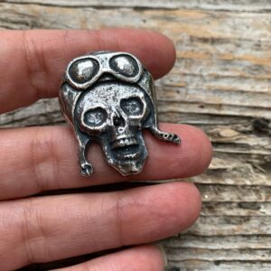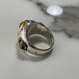 SMALL 2-TONED HEAVY 13 SKULL AND CROSSBONES BIKER RING, HORSE SHOE SIDE