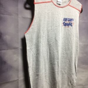 CUT-OFF MUSCLE SHIRT W/ CONTRAST STITCHING & HERE COMES TROUBLE GRAPHIC