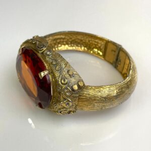 *SIGNED ORNATE HINGED BRASS CUFF BRACELET OVERSIZED AMBER JEWEL ADORNMENT