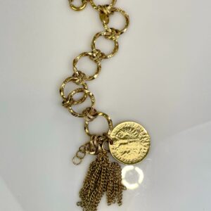 1980S GOLD PLATED TWISTED CHAIN LINK BRACELET, HANGING COIN & TASSEL CHARMS
