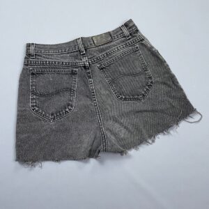 CUT OFF FADED BLACK DENIM HIGH WAISTED SHORTS LEATHER BACK TAG