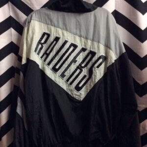 WINDBREAKER JACKET – OAKLAND RAIDERS – COLOR BLOCK DESIGN – SCREEN PRINTED LETTERING ON BACK – LOGO