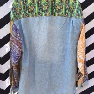 1980’S DENIM SHIRT, LONG SLEEVES BUTTON-UP, ADDED PATCH WORK W/ALLOVER PRINT FABRICS