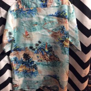 CLASSIC HAWAIIAN SHIRT – POLYESTER – PALM TREES/WATER/SAILBOAT PRINT