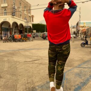 AMAZING DENIM PULLOVER SWEATSHIRT REPURPOSED PANT NECKLINE & POCKET PATCHES WITH LEATHER NECKTIE AS-IS