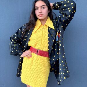 UNIQUE 1980S ASYMMETRICAL AVANT GARDE SILK SIDE BUTTON UP WINDBREAKER WITH FUNKY PRINT & POCKETS