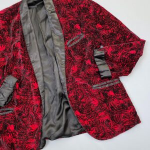GORGEOUS 1960S RED VELVET SWIRLED DESIGN SMOKING JACKET SATIN LAPELS ACETATE LINING