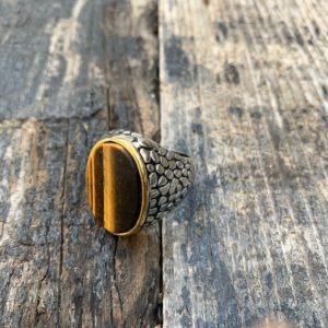 LARGE TIGERS EYE TWO TONED SIGNET RING SCALED TEXTURE SIDES