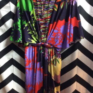 DRESS – V-NECK IN FRONT – V SHAPED BRAIDED BACK INSERT – BRIGHT FLORAL PRINT DESIGN – CINCHED WAIST WITH LOOSE TOP
