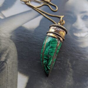LARGE MALACHITE GEMSTONE GREEN BOHO HORN PENDANT NECKLACE W/ THIN BRASS SNAKE CHAIN