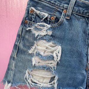 1990S CLASSIC LEVIS 501 BUTTON FLY HEAVY DISTRESSED INDIGO WASHED DENIM SHORTS