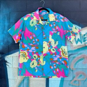 AS-IS 1960S SHORT SLEEVE PASTEL HAWAIIAN SHIRT CUSTOM PAINTED CONEY ISLAND BACK GRAPHIC