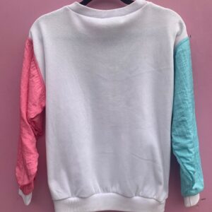 1980S ADORABLE PASTEL PATCHWORK NYLON APPLIQUE PULLOVER SWEATSHIRT SMALL FIT