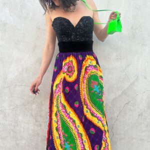 *DEADSTOCK* BRIGHT! 1960S-70S QUILTED PSYCHEDELIC NEON PAISLEY DESIGN MAXI SKIRT VELVET WAIST