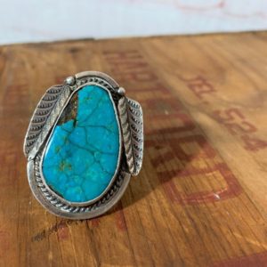 CHUNKY TURQUOISE & STERLING SILVER RING W/ FEATHER/LEAF DESIGN