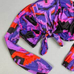 *AS-IS* FUN! 1970S BRIGHT GEOMETRIC PRINT CROPPED LONG SLEEVE TIE FRONT TOP