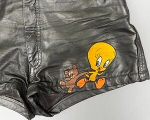 1990S #MOTOMAMI TWEETY BIRD EMBROIDERED DESIGN BLACK LEATHER SHORTS