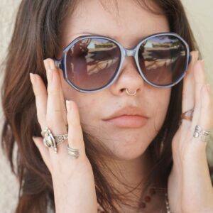 FUNKY CHISELED PEARLIZED BLUE FRAME SUNGLASSES WITH GOLD NOTCH DETAIL
