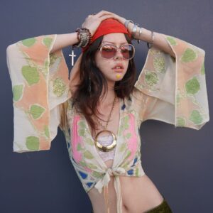 UNREAL! 1970S SHEER HAND PAINTED SILK BELL SLEEVE WRAP TOP LUREX ACCENTS