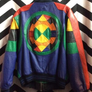 LEATHER COLOR BLOCK JACKET W/CENTRAL CIRCLE/CROSS DESIGN