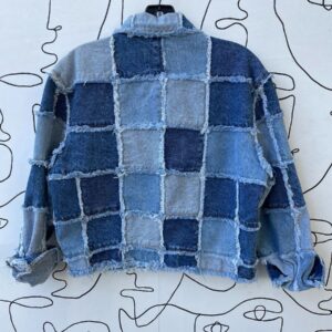 1990S DISTRESSED DENIM PATCHWORK GRID CROPPED JACKET