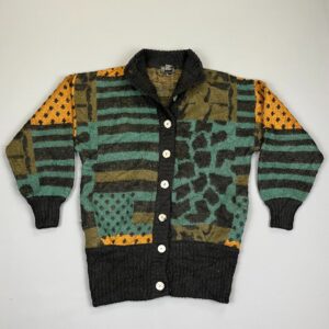 1990S OVERSIZED PATCHWORK LOOK CHUNKY WOOL KNIT CARDIGAN SWEATER
