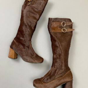 UNREAL! 1960S PONY HAIR COWHIDE ZIPPERED BLOCK HEEL KNEE HIGH GO-GO BOOTS DOUBLE BUCKLE DETAIL – MADE IN SPAIN