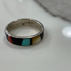ZUNI POLISHED GEOMETRIC STONE INLAY 925 STERLING SILVER BAND RING *SIGNED RU