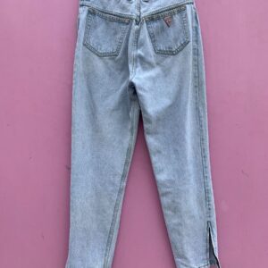 *AS-IS* LIGHT WASH DENIM HIGH WAISTED TAPERED LEG W/ BOTTOM HEM ZIPPER ACCENT DENIM JEANS