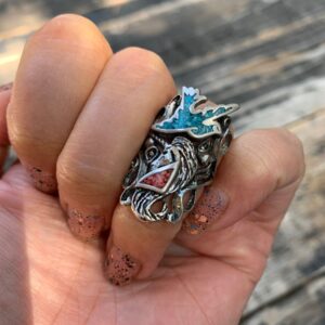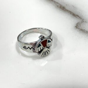 NATIVE AMERICAN THUNDERBIRD SYMBOL CRUSHED TURQUOISE AND CORAL INLAY RING