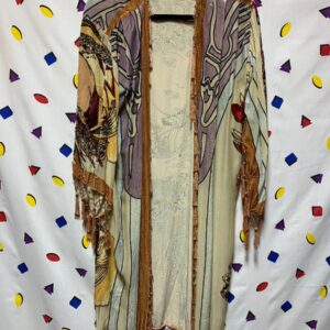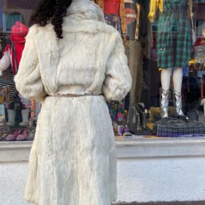1970S FUR TRENCH COAT W/ LEATHER BELT FUNKY PRINTED LINING