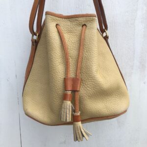 ALL WEATHER LEATHER TWO-TONE CROSSBODY BUCKET BAG W/ TASSEL STRAPS