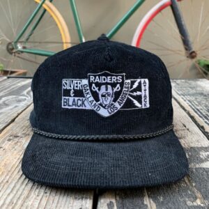 VINTAGE OAKLAND X LOS ANGELES RAIDERS SILVER & BLACK CORDUROY HAT ZIPPER BACK