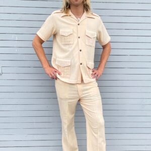 1970S CRINKLED GUAYABERA STYLE HAVANA SHIRT & MATCHING PANTS SUIT BRAIDED DETAILS & COCONUT BUTTONS