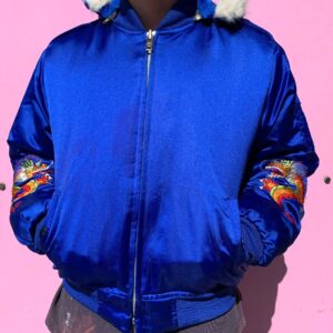 SILKY BLUE FAR EAST TOUR BOMBER JACKET W/ ZIP HOOD EMBROIDERED DRAGON