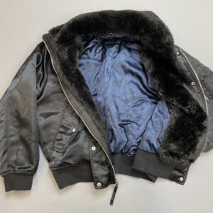 NICE! SILKY FAUX FUR COLLARED ZIP-UP & BUTTONED BOMBER JACKET QUILTED NAVY BLUE LINING