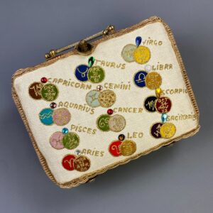 1970\’S ZODIAC BASKETWEAVE WICKER PURSE GOLD HANDLE