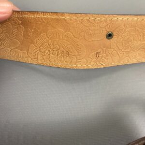 TOOLED LEATHER WESTERN BELT *MARY* METAL LETTERING RECTANGULAR OXIDIZED BUCKLE ORNATE DESIGN